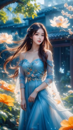 (Good structure),HDR,UHD,8K,A real person,Highly detailed,best quality,masterpiece,1girl,realistic,Highly detailed,(EOS R8, 50mm, F1.2, 8K, RAW photo:1.2),ultra realistic 8k,(best illumination, best shadow, extremely delicate and beautiful),(official art, beautiful and aesthetic:1.2),solo,1girl,long hair,Wind,flowing hair,kind smile,pose for picture,looking_at_viewer,perfect body,wedding dress,(blue dress),(blue theme),jewelry,Garden background,(Floating flower),flowers,liuyifei,dachangtui, glow,Optical particle,Hazy light,Optical particle,High brightness contrast, 1girl
