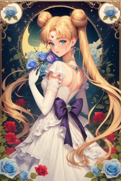 blue_flower,blue_rose,pink_rose,purple_rose,red_rose,rose,white_rose,tsukino_usagi,black_rose,double_bun,flower,1girl,crescent,yellow_rose,pink_flower,thorns,crescent_facial_mark,blonde_hair,black_flower,rose_petals,gloves,crescent_moon,bow,squiggle,spoken_squiggle,princess_serenity,white_gloves,purple_flower,green_flower,dress,elbow_gloves,facial_mark,solo,rose_print,back_bow,white_flower,earrings,twintails,blue_eyes,very_long_hair,venus_symbol,forehead_mark,red_flower,jewelry,moon