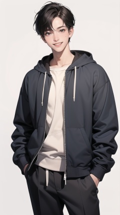 (best quality), ((masterpiece)), (highres), illustration, original, extremely detailed,a boy in a hoodie and sweatpantss is smiling, half body