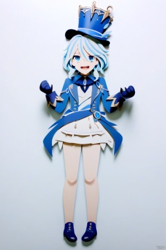 paper-cut,1girl,full body,solo, blue_headwear, looking_at_viewer, white_background, open_mouth, blush, simple_background, tears, hands_on_hips, long_sleeves, blue_jacket, tearing_up, white_gloves, top_hat, ascot, short_hair, white_shirt, flying_sweatdrops, brooch, black_gloves