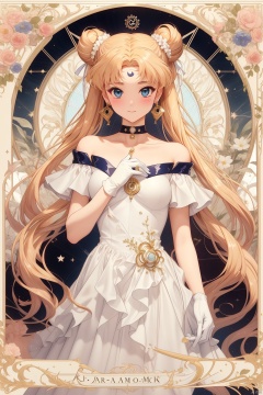 1girl, solo, long hair, looking at viewer, blush, bangs, blue eyes, blonde hair, gloves, dress, bare shoulders, twintails, jewelry, very long hair, closed mouth, collarbone, flower, earrings, white gloves, off shoulder, hair bun, star \(symbol\), white dress, character name, parted bangs, double bun, facial mark, crescent, arm behind back, forehead mark, off-shoulder dress, crescent facial mark, art nouveau, tsukino usagi<lora:EMS-33085-EMS:0.600000>, <lora:EMS-298504-EMS:0.200000>