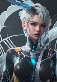 1girl, solo, breasts, looking at viewer, blue eyes, medium breasts, upper body, white hair, multicolored hair, parted lips, lips, bodysuit, skin tight, realistic, nose, black bodysuit, mercy \(overwatch\)