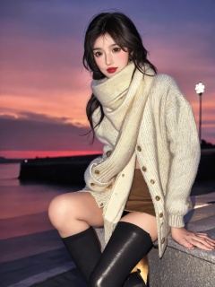 1girl,fashion model,female focus,(masterpiece, realistic, best quality, highly detailed, profession),asian,pretty,Charming eyes,exquisite facial features,bangle,sweater,scarf,skirt,black stockings,boots,sitting,night,neon,beach of city,new year,cinematic composition,,blurry,plns,sw, fireworks, hand101, Light master