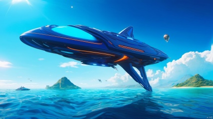 , blue sky, no humans, nature, scenery, Water, beach, ufo, ufo,, A perfectly curved building, (Alien spacecraft 1.9)