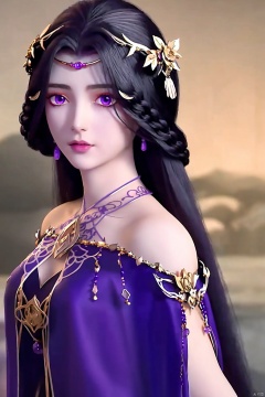 1girl, solo, long hair, looking at viewer, black hair, hair ornament, dress, bare shoulders, jewelry, purple eyes, upper body, earrings, lips, yunxi<lora:EMS-317986-EMS:0.800000>