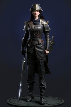 ((HRD, HUD, 8K)),((masterpiece, best quality)), highly detailed,1girl, solo, helmet, black hairweapon, holding, sword, dual wielding, holding weapon, holding sword, full body, standing, armor, looking at viewer, closed mouth,  <lora:20240315-1710510343817:0.9>