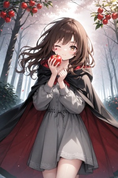 (masterpiece),(best quality),illustration,ultra detailed,hdr,Depth of field,(colorful),Artist Rta, 1girl, brown hair, fruit, food, holding, one eye closed, cloak, apple, solo, hood, dress, looking at viewer, holding fruit, hooded cape, hooded cloak, hood down, holding food, cape, brown eyes, facial tattoo, branch, wavy hair, tree, medium hair, outdoors, one-eyed, black cloak, long hair, long sleeves, closed mouth, tattoo, grey dress<lora:EMS-266888-EMS:0.200000>, <lora:EMS-288516-EMS:0.100000>, <lora:EMS-300688-EMS:0.200000>, <lora:EMS-301024-EMS:0.100000>, <lora:EMS-311400-EMS:0.400000>, <lora:EMS-312802-EMS:0.200000>