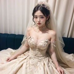 巴洛特风格香槟金色拖尾婚纱 - 1