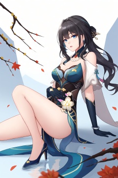 ruanmei, def clothe, 1girl, gloves, blue eyes, black hair, dress, breasts, high heels, chineseclothes,