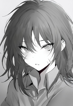 best quality, masterpiece,1girl, monochrome, solo, greyscale, looking at viewer, scar on face, simple background, scar, white background, portrait, messy hair, scar on cheek, bangs, collared shirt, long hair, parted lips, ringed eyes, shirt, medium hair ,_背景<lora:lpmyaXLlokr4f-000143:1>