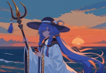 (best quality), ((masterpiece)), (highres), illustration, original, extremely detailed,  <lora:城静时光茶香美:0.7>1girl, holding, solo, long hair, braid, hat, phone, twin braids, holding phone, upper body, looking at viewer, cloud, wide sleeves, sky, closed mouth, long sleeves, blue hair, horizon, cellphone, staff, ocean, holding staff, outdoors, very long hair
