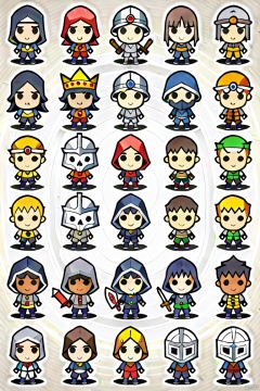 long hair, looking at viewer, short hair, multiple girls, blonde hair, simple background, brown hair, black hair, holding, closed mouth, standing, yellow eyes, weapon, multiple boys, sword, dark skin, hood, chibi, cape, holding weapon, armor, black eyes, mask, facial hair, holding sword, dark-skinned male, helmet, crown, hood up, 6+boys, shield, holding shield