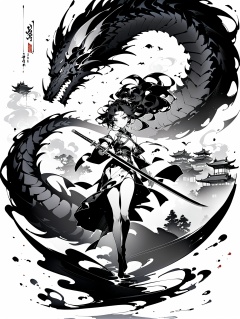 masterpiece,best quality,ink painting,Black and white,masterpiece,best quality,((a chinese girl holds a long sword,a big dragon in the back ground,))detailed face,full body,messy floating hair,disheveled hair,perfect hands,<lora:Multiple styles_XL 1.0:0.8>,