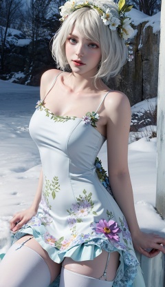 masterpiece,highres,1girl,solo,sfw,<lora:add_detail:0.3>,thighhighs,((beautiful Dress+stocking):1.25),((flower headdress:1.45)),((white theme:1.5)),snow,outdoors,snowflakes,sleeveless,3D graphics,looking_at_viewer,front view,dynamic pose,ashley,<lora:ashleyre4r-000005:0.7>,