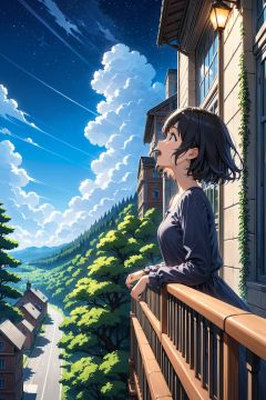 masterpiece, best quality, 1girl, solo, outdoors, scenery, black hair, blue sky, building, cloud, day, forest, flying, from side, lamppost, nature, night, open mouth, profile, railing, short hair, sky, star \(sky\), starry sky, sunlight, tree