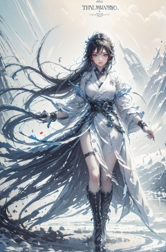 (1girl:1.7),((solo)),((a beautiful girl)),(((full body shot))),((standding on liquid)),(facing away),(+perfect hand+:1.21),(((white coat))),((beautiful white dress+white knee boots)),((Belts)),((white hat)),(white scarf),(leg loops),(((long white_hair))),