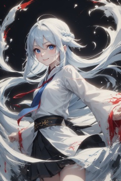1girl, solo, long hair, looking at viewer, smile, bangs, blue eyes, skirt, shirt, long sleeves, hair between eyes, very long hair, closed mouth, school uniform, blue hair, standing, white shirt, ahoge, white hair, multicolored hair, pleated skirt, necktie, sky, sdmai, smwuxia Chinese text blood weapon:sw, wuxia,blood splatter motion blur