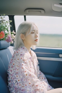 A young girl with white hair sitting in car filled with flowers,art by Rinko Kawauchi,in the styleof naturalistic poses,vacation dadcore,youth fulenergy,a coolexpression,body extensions,flowers in the sky,analog film,super detail,dreamy lofiphotography,(colourful),covered in flowers anovines,(Inside view:1.5),shot on fuiifilm XT4,Inside car,(red|yellow|orange|purple|blue flower),a large number of flowers grow inside the car,a scene full of illusions,perspective taken from the interior of a car,the girl leaned lazily in the car,white hair,
