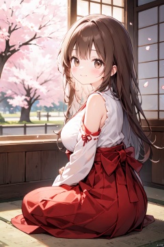 1girl, bare_shoulders, blush, breasts, brown_eyes, brown_hair, butt_crack, cherry_blossoms, detached_sleeves, hakama, hakama_skirt, japanese_clothes, large_breasts, long_hair, looking_at_viewer, nontraditional_miko, petals, red_hakama, sitting, skirt, smile, solo
