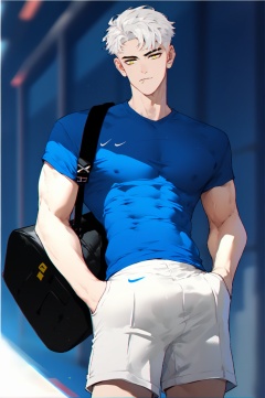 <lora:lymss1:0.8>,1boy,lymss,solo,muscular,short hair,upper_body,close-up,white hair,bag,yellow eyes,shirt,white shorts,blue shirt,short hair,hands in pockets,sportswear,, score_9,score_8_up,score_7_up,score_6_up,rating_explicit
