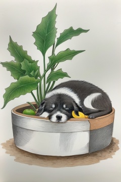 ((HRD, HUD, 8K)),((masterpiece, best quality)), highly detailed, soft light,ColoredLead, no humans, flower, dog, traditional media, closed eyes, animal, white background, sleeping, leaf, bug, animal focus, fruit, simple background, food, plant,  <lora:画风-彩铅-ColoredLead_v1.0:0.8>