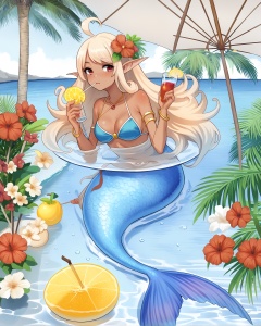 score_9, score_8_up, score_7_up, best quality, masterpiece, <lora:jijia-pony-Tanger-000006:0.8>,jijia, 2d, anime, mermaid, Fishtail, 1girl, dark-skinned female, umbrella, flower, food, blonde hair, long hair, dark skin, hair ornament, hair flower, fruit, monster girl, pointy ears, red eyes, cup, tree, palm tree, lemon, water, breasts, ahoge, swimsuit, drinking glass, bracelet, jewelry, tentacles, bikini, solo, medium breasts, armlet, holding, drinking straw, lemon slice, coconut,a drawing of a mermaid with an umbrella,a mermaid holding a parasol and a blue mermaid sitting in the water