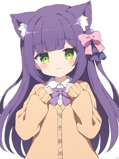 Best-A,tyakomes,1girl, animal_ear_fluff, animal_ears, blush, bow, bowtie, brown_cardigan, buttons, cardigan, cat_ears, cat_girl, closed_mouth, collared_shirt, commentary, dot_nose, hair_bow, highres, long_bangs, long_hair, long_sleeves, looking_at_viewer, original, pink_bow, pink_hair, purple_bow, purple_bowtie, purple_hair_girl_\(tyakomes\), raised_eyebrows, school_uniform, shirt, sidelocks, simple_background, sleeves_past_wrists, smile, solo, straight_hair, symbol-only_commentary, tyakomes, v-neck, variant_set, white_background, white_shirt