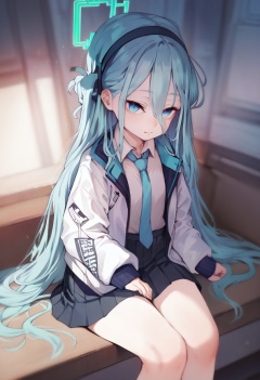 score_9, score_8_up, score_7_up, score_6_up, <lora:michikingXL_P6_lokr_V4236:1> aris \(blue archive\), 1girl, solo, blue eyes, blue necktie, necktie, long hair, jacket, skirt, black hair, shirt, black skirt, very long hair, hairband, indoors, blue hair, pleated skirt, black hairband, white jacket, sitting, chibi, halo, open jacket, long sleeves, open clothes, closed mouth, hair between eyes, white shirt