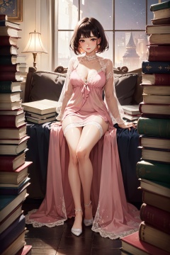 (masterpiece, best quality, hires, high resolution:1.2), (beautiful, aesthetic, perfect, delicate, intricate:1.2), (cute, adorable), (depth of field:1.2), (1girl, solo), (a sexy mature woman sitting on her bed), (sexy pink nightgown), (lace stockings), (colorful short hair), (natural breasts), (sitting:1.4), (stacks of books on the floor), (pile of books), (dark theme:1.4), (at night), (full body shot:1.4),