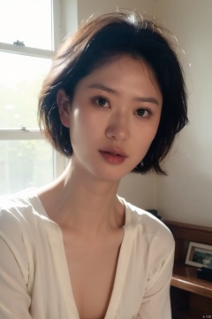( chiaroscuro,Fujicolor, UHD, super detail ,raw,85mm,f/1.2,FujifilmXT4,),1girl, solo, short hair, looking at viewer, shirt, black hair, closed mouth, white shirt, upper body, indoors, black eyes, lips, window, watermark, realistic, nose