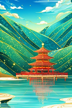 (8k, RAW photo, best quality, masterpiece:1.2,),Realistic,best quality,masterpiece,8K,HDR,RAW,1girl,<lora:add_detail:0.6>,mount,water,foge,chinese style,tower,flower,<lora:ENNE 只此青绿_v10:0.9>,zcql,