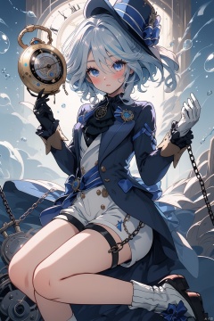 furina, gloves, solo, blue eyes, shorts, shirt, long sleeves, looking at viewer, blue hair, jacket, ascot, hands up, bow, black gloves, hat, white shirt, white gloves, bubble, brooch, bangs, hair between eyes, gears, jewelry, thigh strap, pocket watch, lapels, hat bow, watch, blue bow, androgynous, black jacket, socks, 1boy, gem, frills, male focus, shoes, white socks, black footwear, long hair, key, white shorts, blush, glint, air bubble, white ascot, eyelashes, headwear removed, medium hair, hair intakes, blue ascot, bowtie, open jacket, vision \(genshin impact\), blue gemstone, buttons, light blue hair, chain