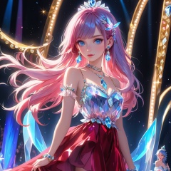 1 girl, solo, long hair, looking at the audience, bangs, blue eyes, jewelry, pink hair, earrings, parted lips, necklace, parted bangs, gray eyes, crystal slipper, bust, luminous, red skirt