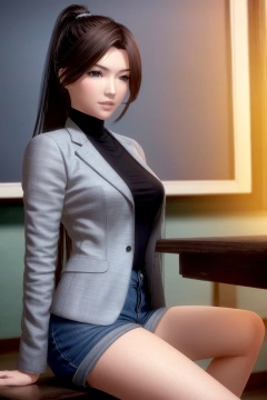 ((HRD, HUD, 8K)),((masterpiece, best quality)), highly detailed, soft light,1girl, solo, black hair, brown hair, long hair, ponytail, lips, black eyes, (t-shirt:1.2), (blazer:1.2), denim shorts, blurry background, classroom, chalkboard, sitting, cowboy shot, looking at viewer, <lora:20240504-1714817809601:0.7>