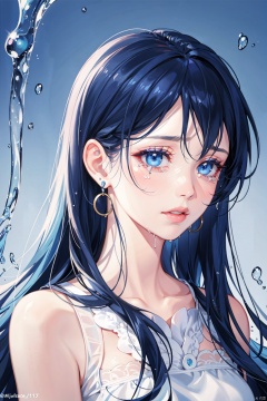 , 1girl, solo, rain, wet hair, parted lips, blue eyes, wet, blue hair, bangs, profile, lips, long hair, from side, tears, crying, portrait, crying with eyes open, nose, eyelashes, water drop, messy hair, earrings, blue background, jewelry, looking away
