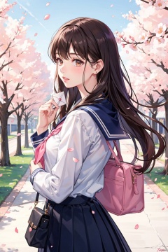 , 1girl, solo, skirt, school uniform, brown hair, pleated skirt, holding, serafuku, white shirt, blue skirt, shirt, bag, sailor collar, blush, long sleeves, cherry blossoms, blurry, long hair, love letter, branch, blue sailor collar, depth of field, signature, bangs, petals, envelope, school bag, outdoors, brown eyes, neckerchief, blurry background, day, hands up, letter, holding envelope, looking at viewer, profile, blurry foreground, standing, flower, pink flower, parted lips, red neckerchief, from side, spring \(season\), looking back