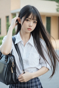masterpiece,Realism,best quality,loli,1girl, long hair, bag, black hair, solo, school uniform, shirt, sleeves rolled up, blurry, looking at viewer, skirt, school bag, white shirt, realistic, lips, depth of field, upper body, black eyes, shoulder bag, brown eyes, nose, parted lips, plaid, plaid skirt, collared shirt
