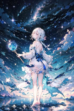 (masterpiece), (best quality), (ultra-detailed), (((illustration))), ((an extremely delicate and beautiful)), (detailed light), 1girl, cold theme, broken glass, broken wall, ((an array of stars)), ((starry sky)), the Milky Way, star, Reflecting the starry water surface, (1girl:1.3)aqua theme, white hair, blinking, white dress, closed mouth, constel lation, flat color, noline art, full Glass sphere, girl inside glass sphere, white hair, braid, blinking, white robe, bust \(sculpture\), barefoot, float, closed mouth, constel lation, flat color, holding, holding wand, looking up, standing, male focus, medium hair, standing, solo, space, universe, utaite(singer), Nebula, many stars,fanxing,sparkling dress, WuLight, backlight, houtufeng, sky