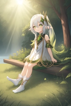 nahida, cross-shaped pupils, 1girl, nahida \(genshin impact\), dress, green eyes, pointy ears, nature, white hair, smile, hair ornament, side ponytail, symbol-shaped pupils, multicolored hair, white dress, sitting, forest, long hair, braid, mushroom, closed mouth, looking at viewer, outdoors, gradient hair, toes, green hair, green sleeves, toeless legwear, sleeveless dress, detached sleeves, sleeveless, jewelry, bracelet, leaf hair ornament, feet, tree, stirrup legwear, cape, soles, solo, bangs, socks, bare shoulders, water, no shoes, green cape, full body, sunlight, toeless footwear, white socks, plant, hair between eyes, white footwear, grass, gold trim, female child