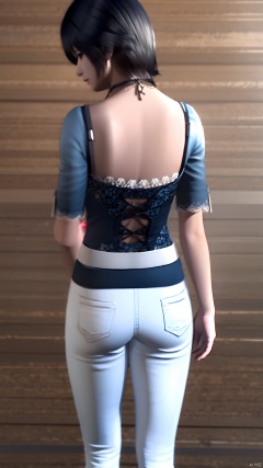 HeiZeLin, dark blue daily clothes,black jeans, breasts, short hair, simple background, black hairm, lace, navel, white belt, black pants, necklace, hand on hip, realistic, Neck rope, back, from behind, facing away