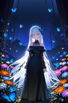 (masterpiece),(best quality),night,glowing eyes,gothic,long dress, 1 girl, solo, long white hair, blue eyes, detailed eyes, blink and youll miss it detail,butterfly, flower garden, high quality, floral background, very detailed,off shoulder