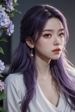 best quality,masterpiece,X-Yunxiao,1girl,solo,long hair,looking at viewer,jewelry,closed mouth,purple eyes,upper body,purple hair,earrings,blurry,blurry background,sunlight,red lips,(big breasts:1.39),X-Yunxiao,X-Hydrangea, traditional chinese ink painting,ll-hd