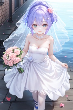 bangs, hair ornament, dress, bow, ribbon, hair between eyes, bare shoulders, green eyes, ponytail, purple hair, flower, pantyhose, small breasts, white dress, high heels, petals, strapless, rose, white footwear, veil, bridal gauntlets, strapless dress, pink flower, ((white pantyhose)), thighband pantyhose, bouquet, wedding dress, purple flower, bridal veil, torpedo, pink rose, holding bouquet, javelinWedding,