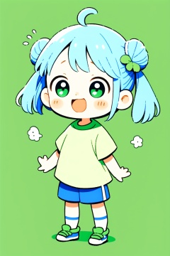 <lora:pencil style-7:0.8>,guchen,pencil style,chibi,1girl,solo,green eyes,shirt,blue shorts,blue hair,white background,hair bun,ahoge,shorts,open mouth,green shirt,smile,twintails,hair ornament,full body,double bun,simple background,short sleeves,standing,child,shoes,:d,blush,flying sweatdrops,