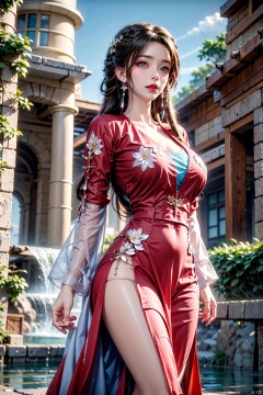 masterpiece,best quality,extremely high detailed,intricate,8k,HDR,wallpaper,cinematic lighting,(universe:1.4),Huge chest, 1girl, solo, long hair, looking at viewer, blue eyes, brown hair, black hair, long sleeves, dress, jewelry, standing, braid, earrings, outdoors, parted lips, sky, day, cloud, water, red dress, from side, lips, wet, see-through, floral print, building, wet clothes, red lips, architecture,limuwan