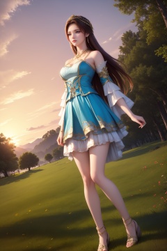 1girl, solo, long hair, dress, brown hair, sky, hair ornament, bare legs, full body, white dress, sunset, high heels, jewelry, bare shoulders, outdoors, dutch angle, grass, cloud, closed mouth, detached sleeves, sandals, tree, thighlet, white footwear, legs, dusk, blue dress, standing, expressionless, bush, skirt, blue eyes, anklet, twilight, looking to the side, tiara, mountain, breasts, earrings