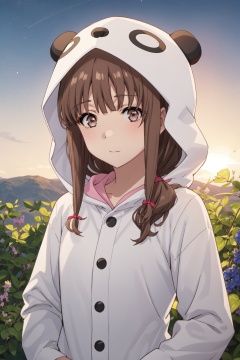 <lora:Kaede-000015:0.8>,Kaede CYQL,1girl,looking at viewer,solo,brown_hair,long_hair,brown_eyes,animal_costume,hood,pajamas,tearing_up,upper_body,Sunset, Vineyard, Grapes, Sky, Colors, Horizon, Serenity, Harvest,(Rose bushes, Trellises, Garden path, Rose fragrance, English elegance, Rose petals:0.5),beautiful detailed sky,beautiful detailed glow,posing in front of a colorful and dynamic background,masterpiece,best quality,beautiful and aesthetic,contrapposto,female focus,wallpaper,