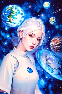 Watercolor, Watercolor painting, Color ink painting, Hand-drawn, Splash ink, Color ink, Rich in color, Pigment spraying, 1girl, solo, looking at viewer, short hair, brown eyes, upper body, white hair, parted lips, lips, traditional media, space, planet, earth \(planet\)
