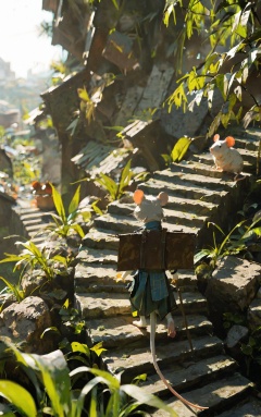 best quality, masterpiece, (ultra-detailed:1.1), good background, oil painting, [<lora:EndlessSteps-v2-Kohaku-Tanger:0.75>, ::0.75], Endless Steps, Climbing stairs, CG, no humans, blurry, scenery, mouse, outdoors, depth of field, animal, plant, day, rock, chinese zodiac, a couple of mice are walking on a path, a small white mouse and a small grey mouse on top of a stone wall,