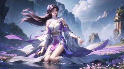 1girl,solo,bracelet,flower,long purple_hair,purple dress,otus, hair ornament, bare legs, sky, jewelry, lily pad, bug, flower, mountain, solo, sitting, water, blue sky, butterfly, brown hair, chinese clothes, purple hair, youcai